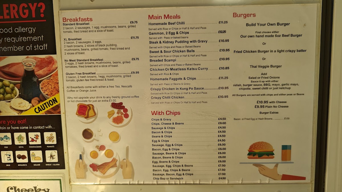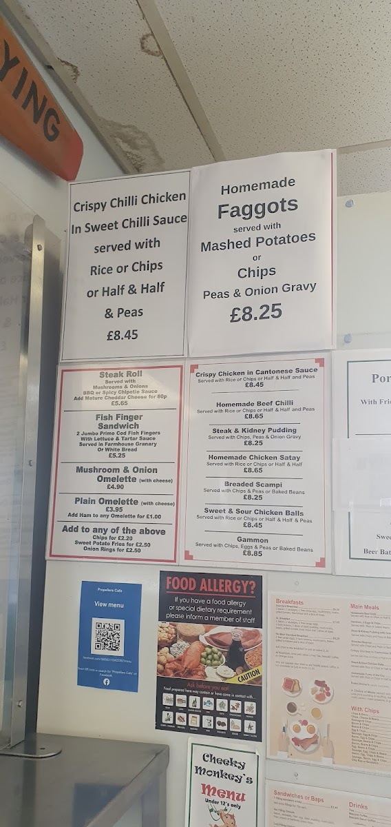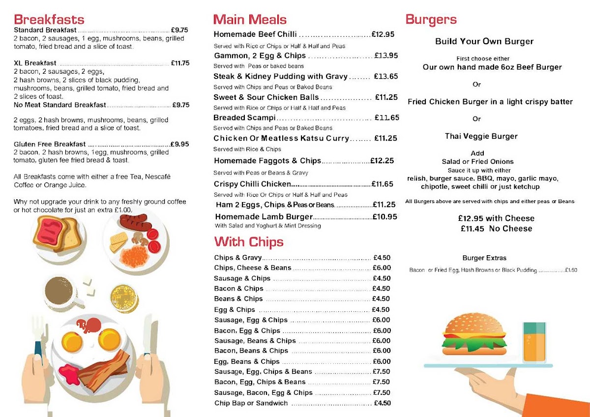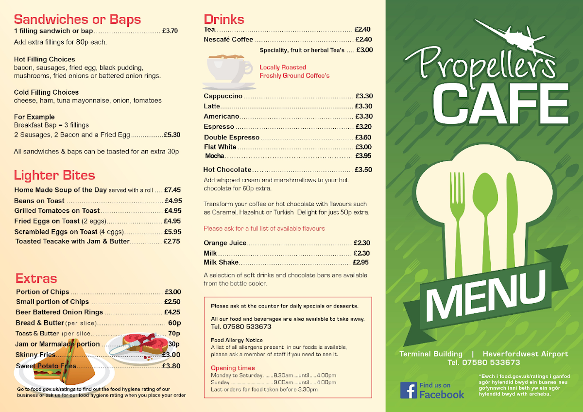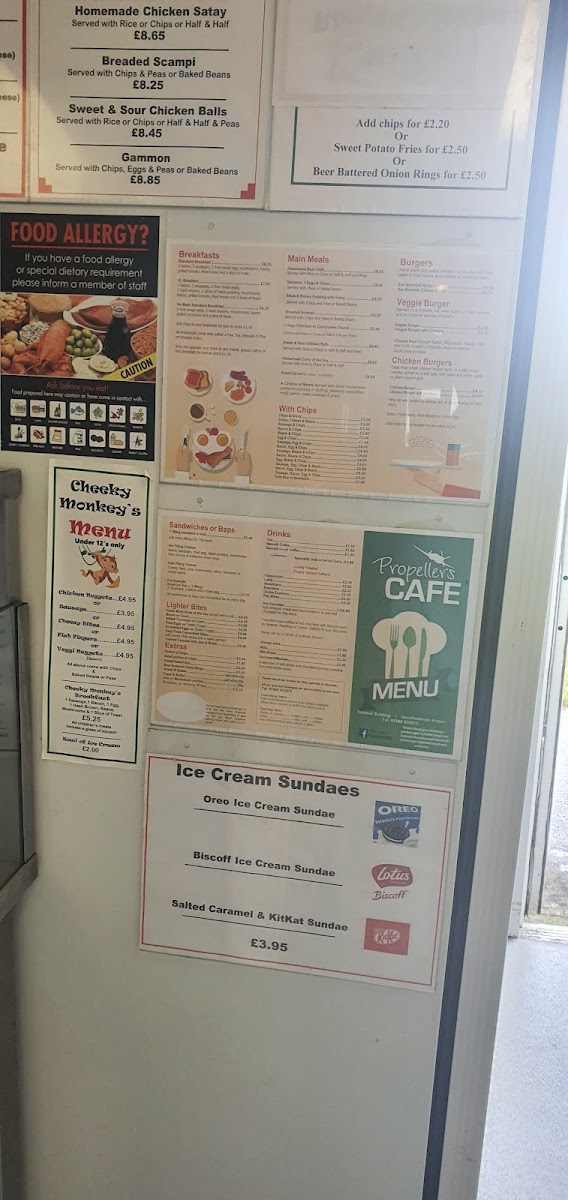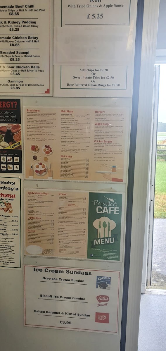 Propellers Cafe at the Terminal Building in Haverfordwest offers a menu that is both comforting and versatile, catering to a wide range of tastes. Breakfast options include the hearty Standard Breakfast and XL Breakfast, along with a No Meat Standard Breakfast and a Gluten Free Breakfast, ensuring that early-morning cravings are well-covered. For lunch or dinner, the main meals impress with choices like Homemade Beef Chilli, Gammon, 2 Egg & Chips, Sweet & Sour Chicken Balls, Breaded Scampi, and Chicken or Meatless Katsu Curry, offering both classic and adventurous flavors. Burger enthusiasts can enjoy the Build Your Own Burger, which provides a customizable experience, while those seeking simple comfort can choose from a variety of sides served with chips, including Chips & Gravy, Chips, Cheese & Beans, Sausage & Chips, Bacon & Chips, and Beans & Chips. Overall, the menu at Propellers Cafe is straightforward yet satisfying, blending traditional British café fare with flexible options for different dietary preferences, all presented at approachable prices.